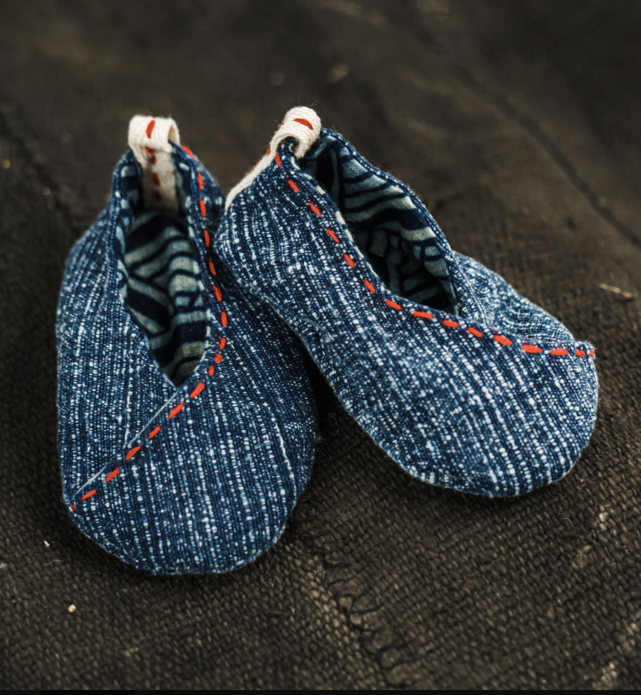 These baby shoes are fully reversable, with a tumbled denim on one side, and indigo-dyed cotton pattern on the other. The details have been hand-stitched, and look great from both directions. We’ve even added an easy-pull tab.