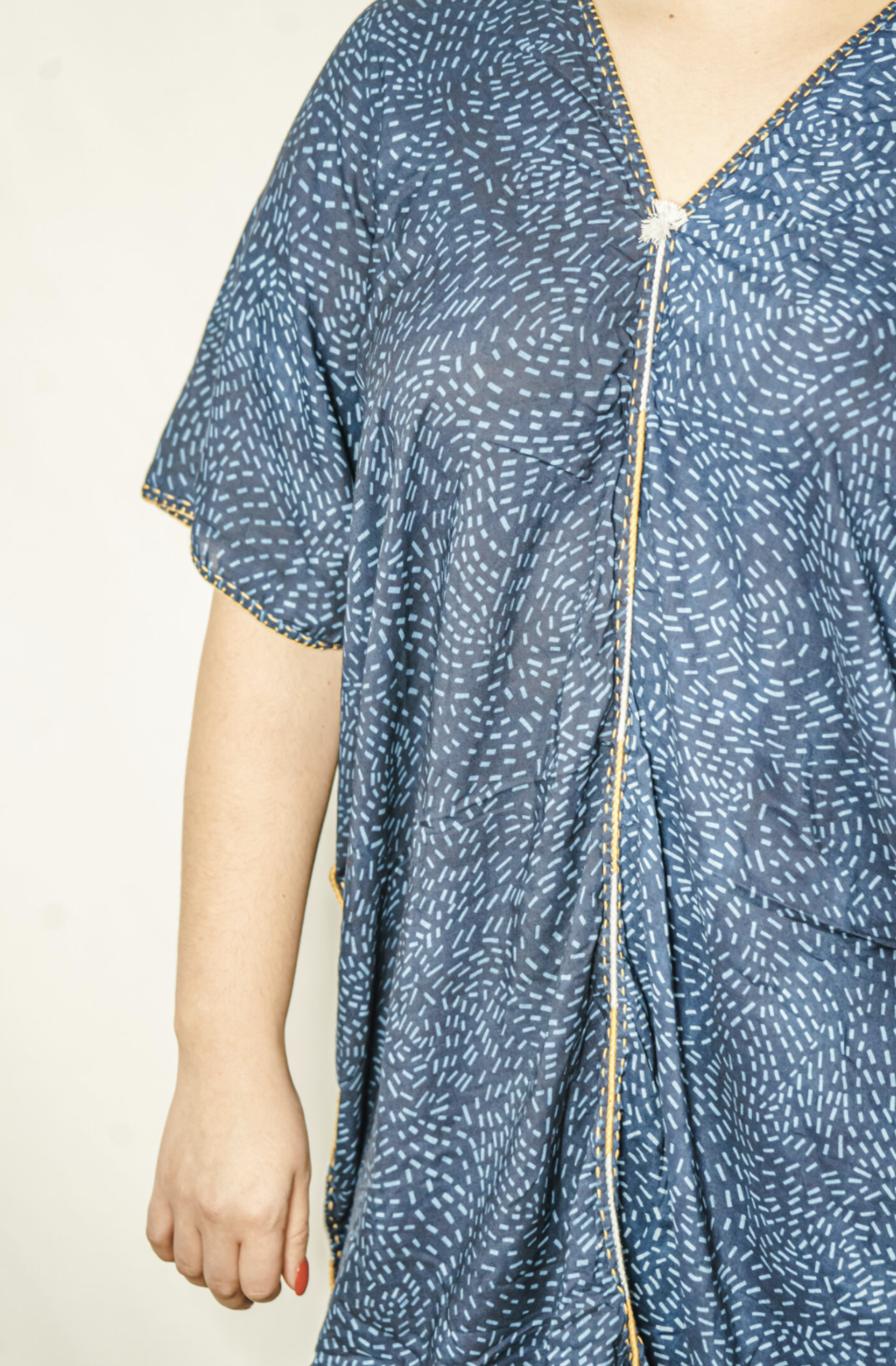 This kaftan was made by a cooperative group of former street sweepers in Chiang Mai, Thailand. By purchasing, you are giving women an opportunity to live a less strenuous life.